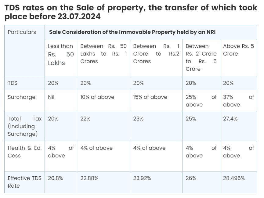 TDS rates on Sale of property held by NRI, transfer of which took place before & after 23.07.2024 (Amended in Finance Bill 2024)